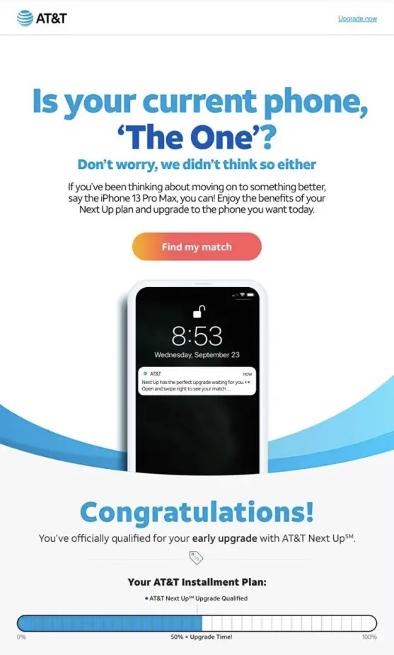 The problem: Next Up customers aren’t upgrading their phones before they roll off their AT&T contracts. Create an email and SMS campaign to entice early adopters with new technology and pacify their FOMO.